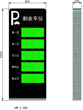 型 号: DPS-5520 工作电压: AC 220V 通讯方式: RS485 @ 9600bps 功 耗: 50W(单层) 通讯距离: 300m 工作温度: -20℃ ~ 65℃ 光 源: 绿LED灯珠 防护等级: IP67 尺 寸: 可根据客户需求定制 外观材质: 冷钢烤漆 钢化玻璃面板 表3.1 室内引导屏技术参数表