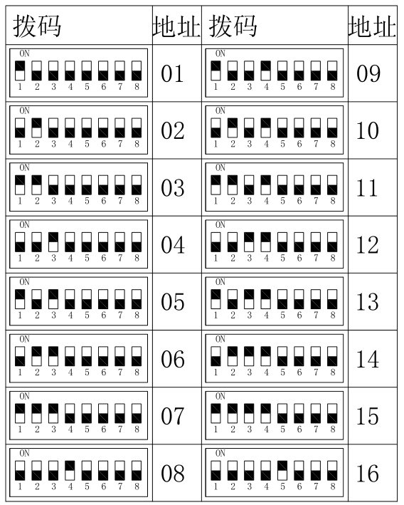 图5.2 户外引导大屏拨码示意图注意:拨码1在OFF,拨码2~8在ON,此时LED模组的地址是1;拨码2在OFF,拨码1,3~8在ON,此时LED模组的地址是2;以此类推,如图5.2;2)接线RS485线接到节点控制器的L1~L5;红线接A,黑线接B;注意:可以手拉手串联其他的车位引导屏,每一路RS485总线串联LED模组的数量总计不能超过8个。电源就近接入AC220V